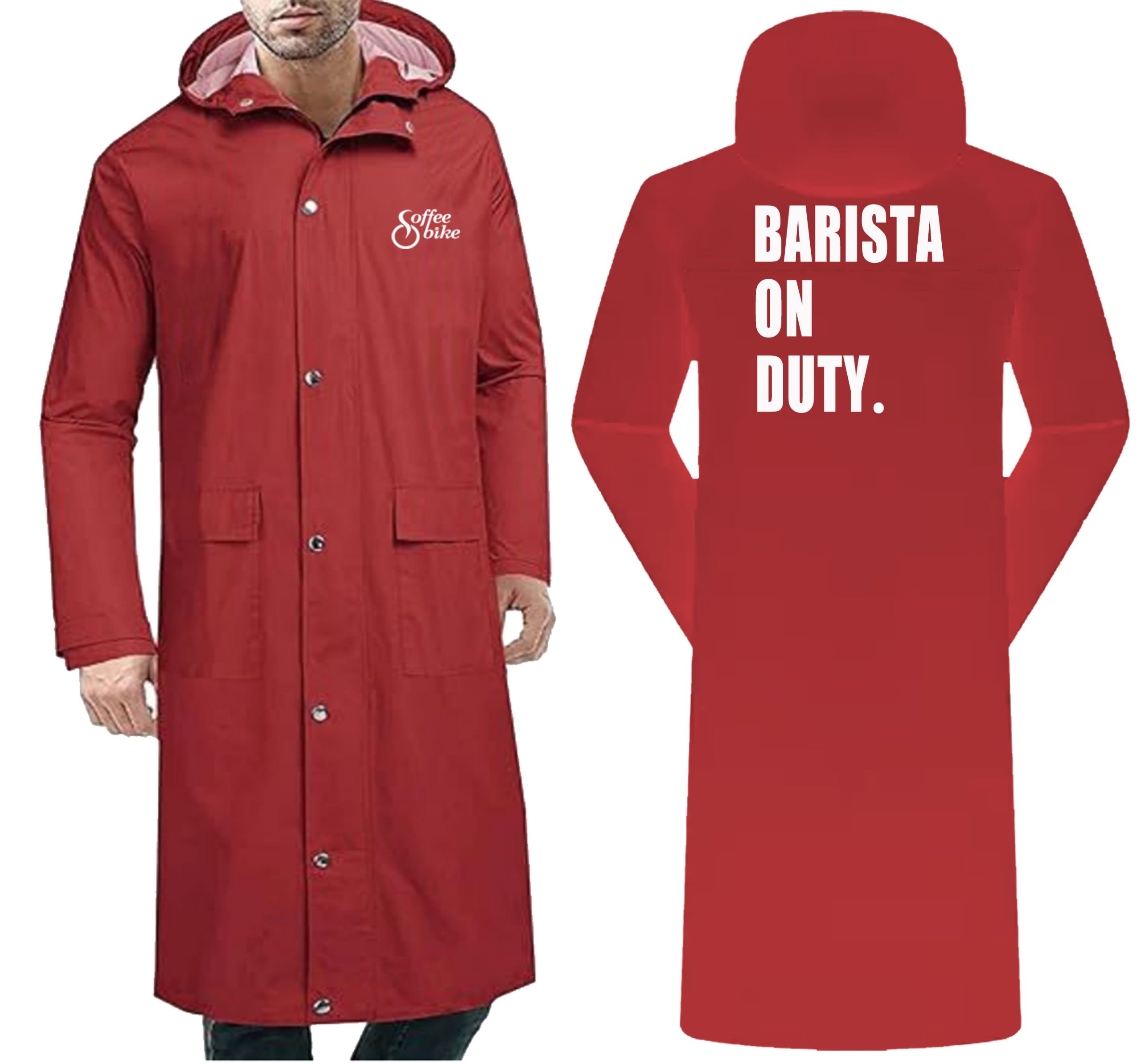 Stylish oversized “Barista On Duty” Rain coat custom branded for your Coffee Bikes; full body length to protect your barista from the toughest rain