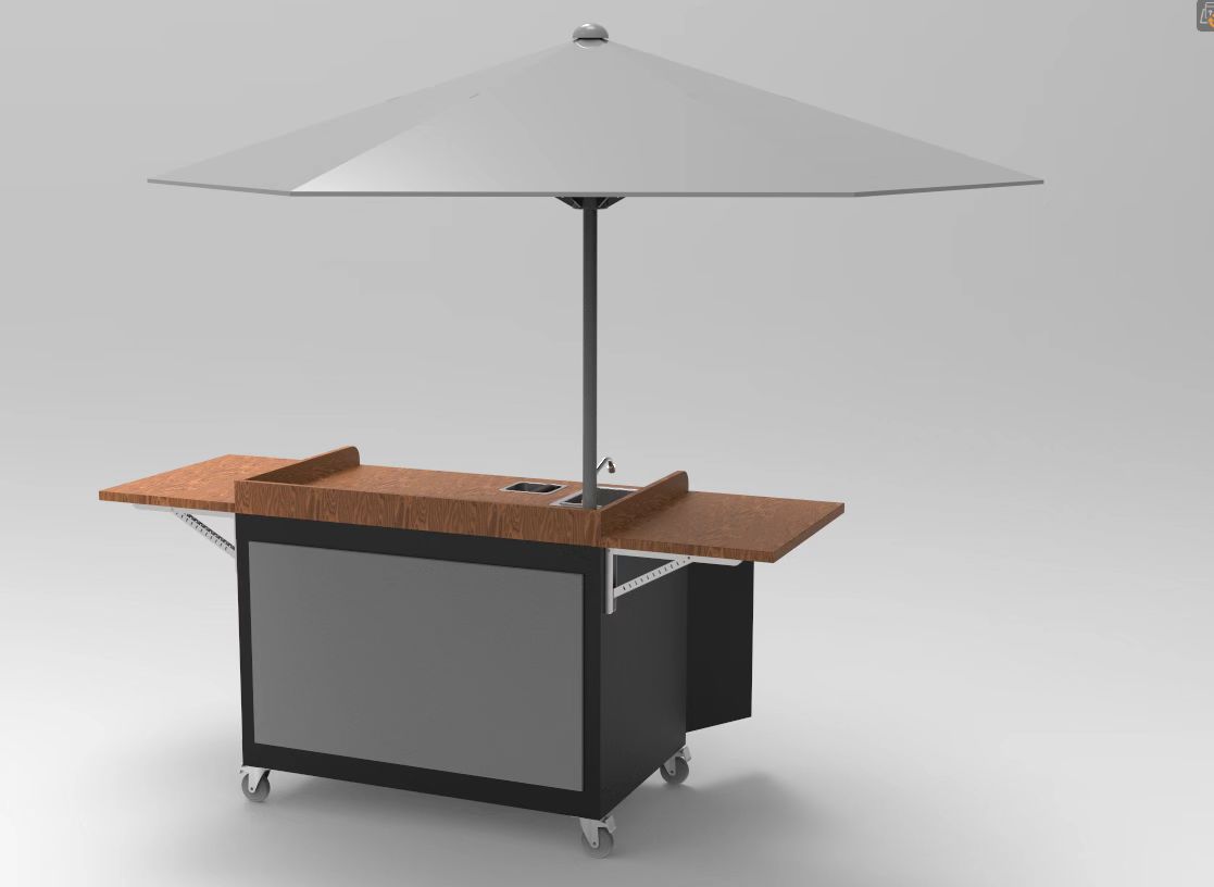Featuring signature LED screen where you can upload your customers’ logos, images, videos. Elegant design, full plumbing system (fresh and dirty water tank, pump, filter, sink, faucet, pitcher rinser, espresso machine hook up and drain). fridge, cup dispenser, dry storage, umbrella, custom color). Ideal for catering.
