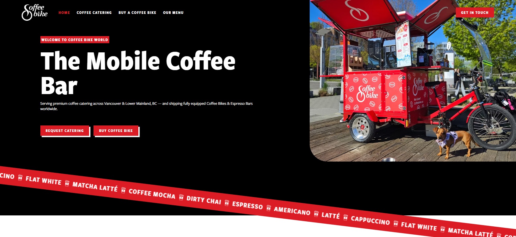Coffee Bike World style website tailored to your personal brand identity coupled with full Search Engine Optimization to get more local brand recognition and catering inquiries