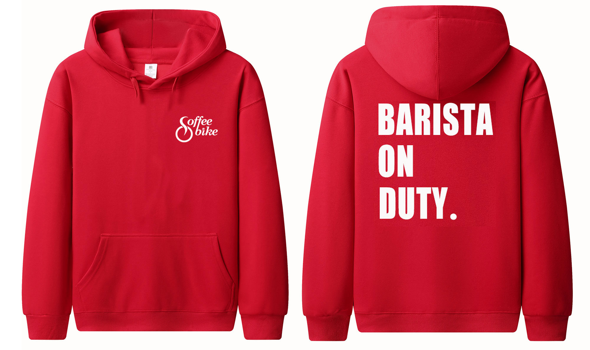 Stylish oversized “Barista On Duty” Hoodie custom branded for your Coffee Bikes; high quality cotton